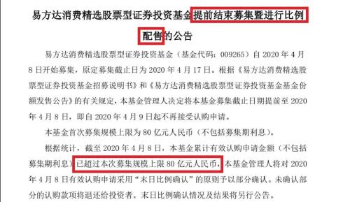易方达官网刚刚也挂出易方达消费精选提前结束募集暨进行比例配售的公告。公告中称,根据统计,截至2020年4月8 日,该基金累计有效认购申请金额(不包括募集期利息)已超过募集规模上限 80亿元人民币,基金管理人将对 2020年4月8日有效认购申请采用“末日比例确认”的原则予以部分确认。