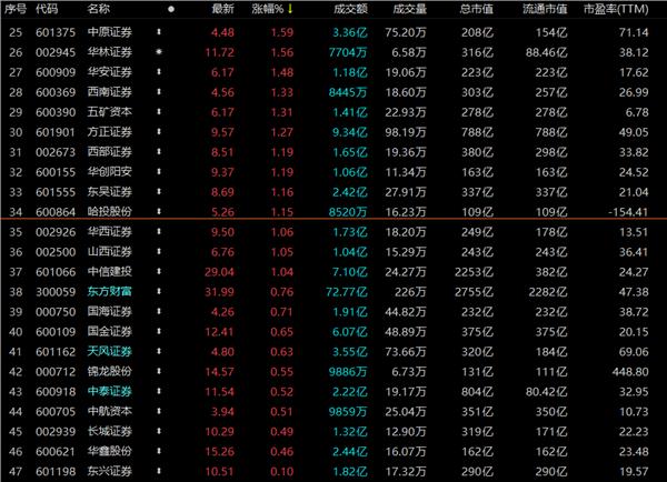 51只概念股中有47只上涨,涨幅超过3%的有9只。其中,南京证券涨停,收报9.68元/股;国泰君安收涨8.89%,报17.03元/股;兴业证券、湘财股份均涨逾5%;财通证券、红塔证券均跌逾3%。