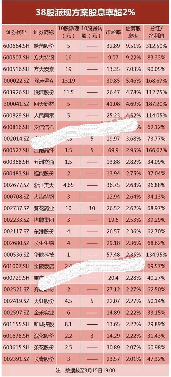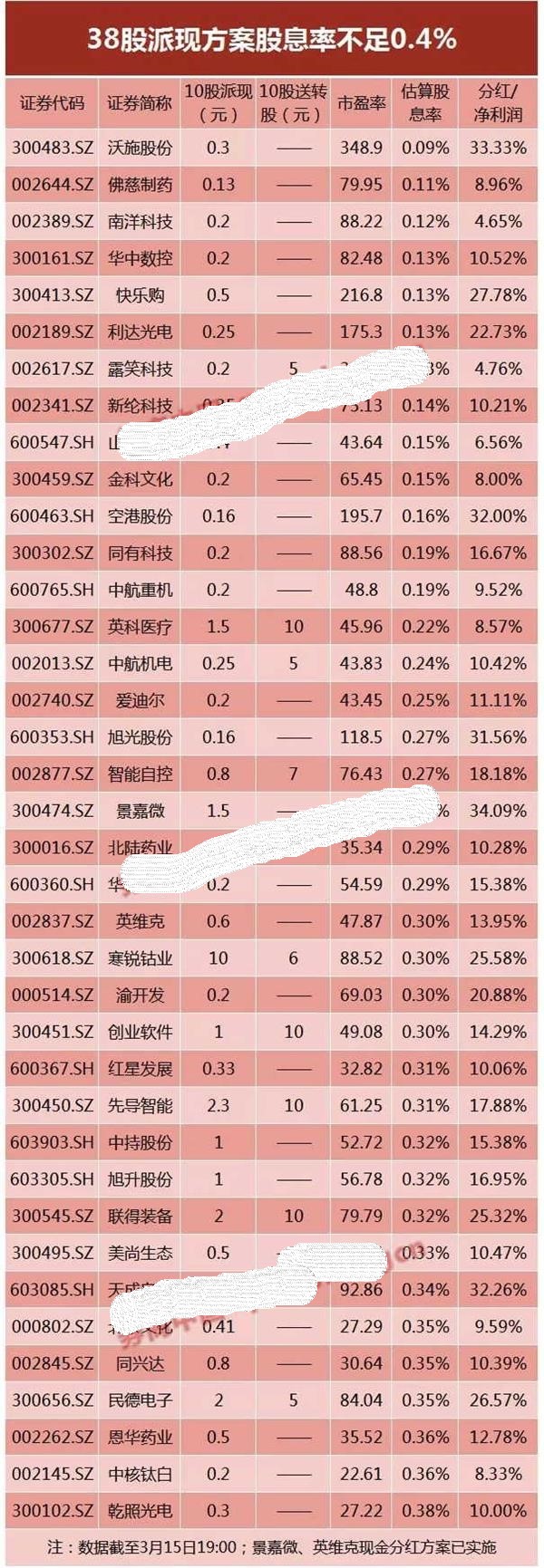 同时,还有36股10派不足0.5元,19股10派不足0.3元,佛慈制药、宋都满满贷股份、旭光股份、空港股份等4股更是10派现不足0.2元。