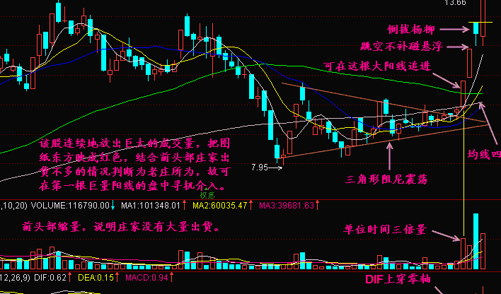 在最近一段时间内,我们随时都能看到这种情景,就是在某一股票里面突然暴出巨大的成交量,就像一轮红日从东方冉冉升起。在我们以前的《短线是银》书本里,把这种连续放量拉长阳叫【东方红大阳升】,就是东方红成一片,大阳就升起来了。这情景使我想起了一段很有名的广告词:“当太阳升起的时候,我们的爱天长地久”,这是太阳神一个很有名的广告。我们把它形象地用来说明一胜利精密股票种特定富国天丰的图案,就是一根巨大的成交量放出来。我们前几天讲什么?讲到【单位时间两倍量追涨法】,而大同水泥今天不是两倍量,它是几倍量啊!两倍量就是达到5均量线两倍,现在它股票收盘前几乎达到6倍量了,这种图形该怎么样操作?我们已经对这种图形有一套可行的操作办法,这就是我们常说的【扎金针】。同学们操作得比较好的话,一般都能够在a点这个位置迅速切入,一下子就扎在这个位置上。