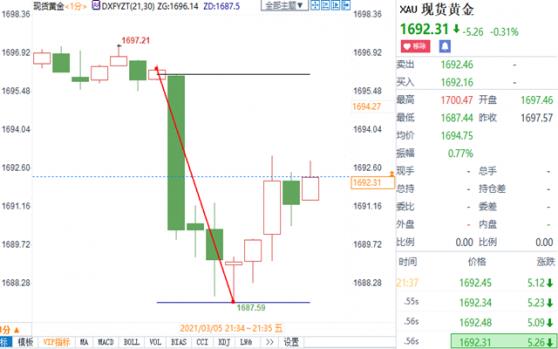 北京时间周五(3月5日)21:30,美国劳工部公布2月非农就业报告,表现显著好于预期和前值,失业率下降。截至发稿,现货黄金下挫逾8美元至1687.64美元/盎司;美元指数跳升近30点至92.192。