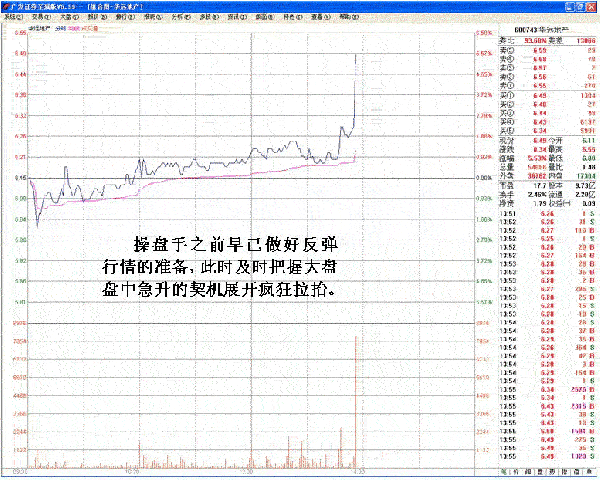 至于6月9日下午13:40分以银行金融股为代表率先启动大幅拉升,地产股随后狂飙,导致两市指数瞬间扭转跌势疯狂飙升的盘面。这是运作华远地产主力操盘手根本没有预料到的。在两市股指出现飙升之后的几分钟,华远地产主力操盘手意识到做多的契机已经出现,并及时利用这一契机展开拉升操作。