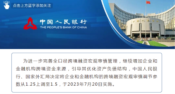 今日,中国人民银行、国家外汇局决定将企业和金融机构的跨境融资宏观审慎调节参数从1.25上调至1.5,于2023年7月20日实施。
