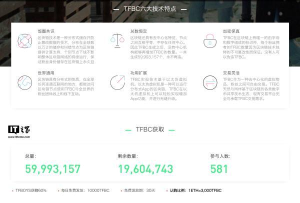 根据官网介绍,TFBC总共发行59,993,157张,是王俊凯(生日1999/09/21)、王源(生日2000/11/08)、易烊千玺(生日2000/11/28)的生日数字相加,数量恒定,截止到2018年2月10日10点13分,参与人数已有581人。