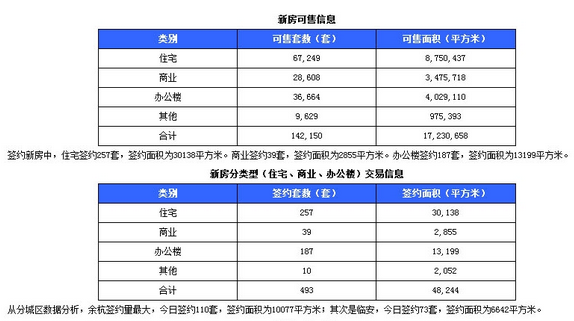 杭州全市新房共签约493套,其中主城区签约169套,萧山42套,余杭110套,富阳35套,大江东17套,桐庐17套,建德10套,淳安20套,临安73套。下城区的新天地中心销售了32套,滨江区的高润·云杉郡销售了16套。