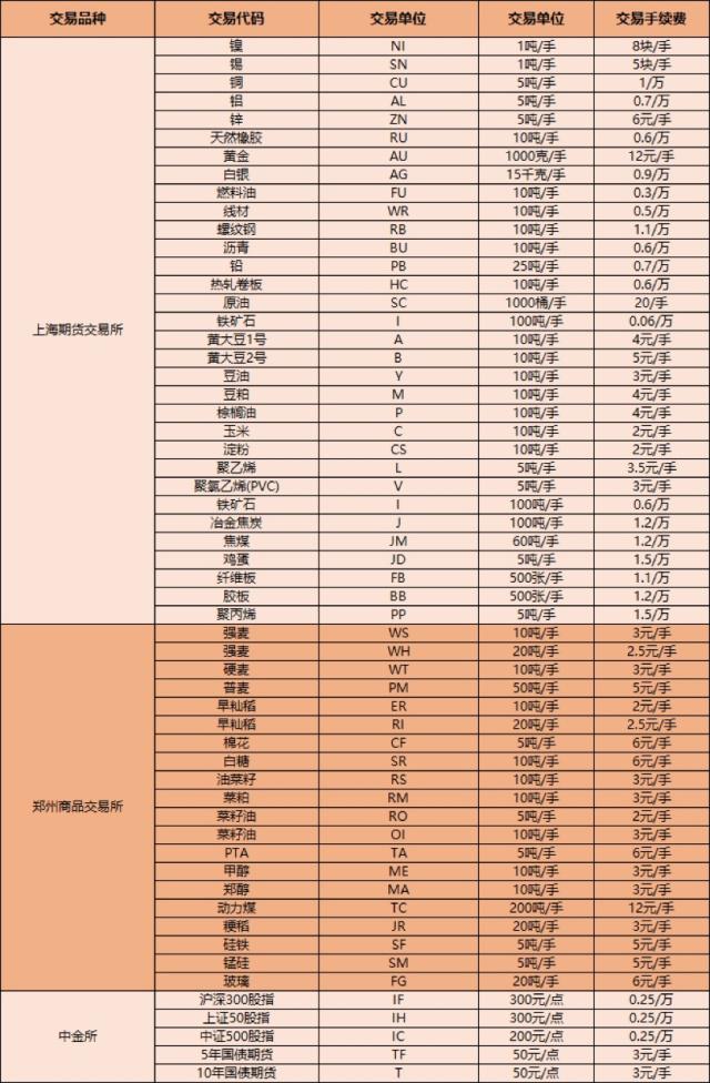 不同期货品种手续费不一样,期货交易所手续费一览: