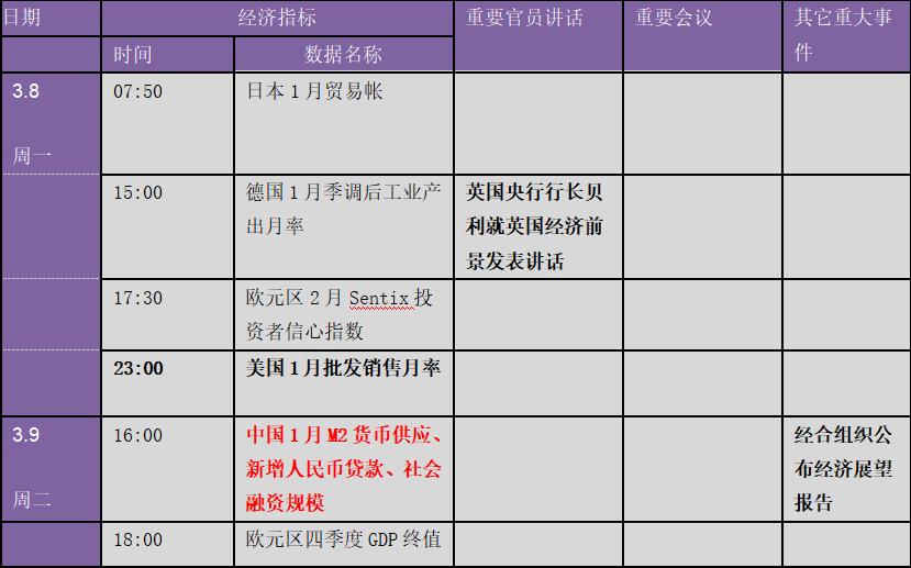 展望下周,重中之重,聚焦美债收益率走势!此外,市场还将迎来一系列经济数据:美国和中国2月通胀数据,中国2月贸易收支,以及日本和欧元区第四季GDP修正值等。重要事件方面,中国两会!央行动态方面,欧洲央行和加拿大央行政策会议,重点可关注欧洲央行对于国债收益率飙升的表态。