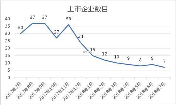 IPO日报整理发现,2018年1-7月新股数量较2017年7-12月呈现猛跌趋势。2017年下半年新增191家新股,月均32家左右,2018年前7个月新增70家新股,月均10家,数量跌掉2/3。